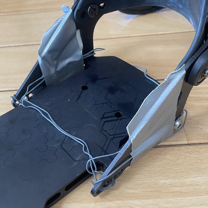 原因が分かれば対策はシンプル。ラチェットのバックルが雪面に干渉しない向きになるよう、ストラップの左右を入れ替えるという方法に行き着きました。