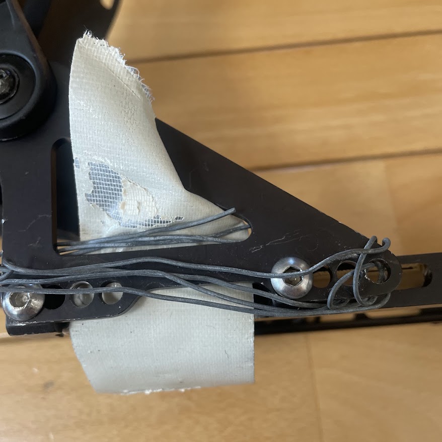 タイラップを使用する場合、左右のネジ穴を利用して互い違いになるようにセット。バランスを確認しながら両方を引き締め末端は爪切りでカット。ダイニーマコードはフリクションノットにして引き絞り、しっかりテンションをかけたあとに数回オーバーハンドノットで止め結びをすればとりあえずは使えそうでした。