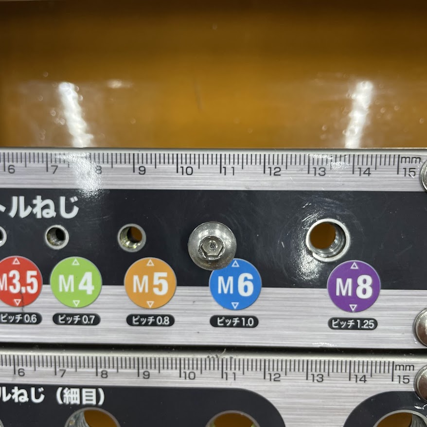 ヒールカップ位置の調整ネジについては、M6×16mm(ピッチ1.0)のプラスネジが適合することが分かったので、探したんですが良いサイズがない!