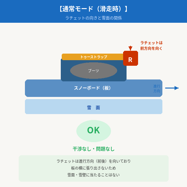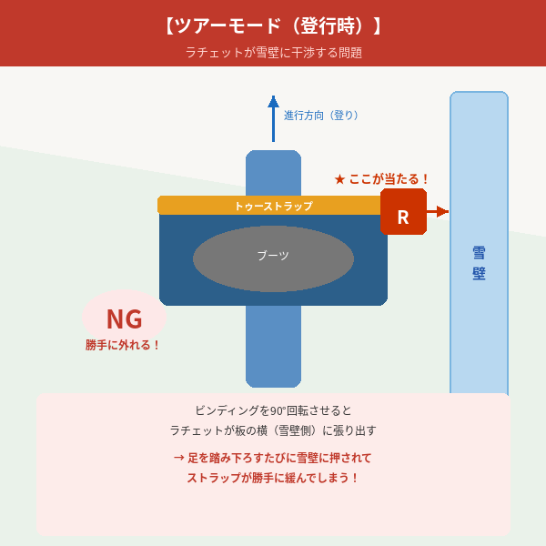 原因を観察してみると、これはスプリットボード特有の構造上の問題でした。通常のスノーボードではビンディングは板の中心に乗るような向きで固定されています。ところがツアーモードでは、板を前向きにして歩くためにビンディングを90度回転させた状態で使います。この結果、通常時は板の前後方向に収まっていたトゥーストラップのラチェットが、板の横方向=斜面の雪壁側に張り出した状態になってしまうのです。