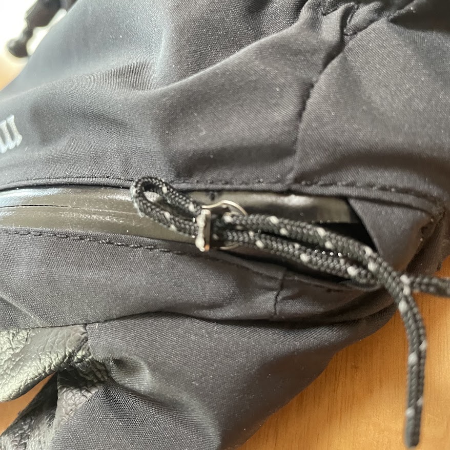 これが推しポイントです。他のメーカーのハンドアウトグローブは開き始めや締め始めでジッパーが引っかかり、うまく開閉できないことがあったのですが、パウダージップミトンはこの引っかかりが全くなく、開け閉めがとてもスムーズ!ストレスなく使用することができます。しかもジッパー自体もアクアテクトジッパーという止水性の高いジッパーになっています(すごい)。